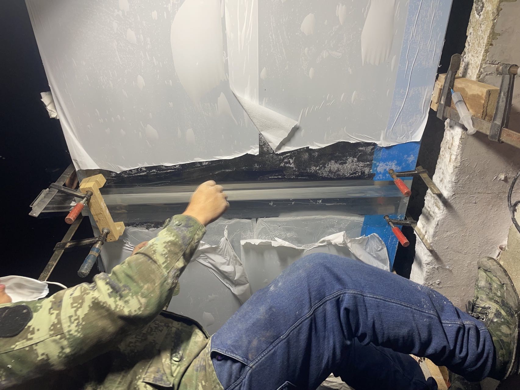 其中两块板由工厂拼接好后和另一块板一起运输到现场,然后由拼接工人在现场把三块板拼接成21米的长板,下图为拼接师傅在制作拼接料灌料口;